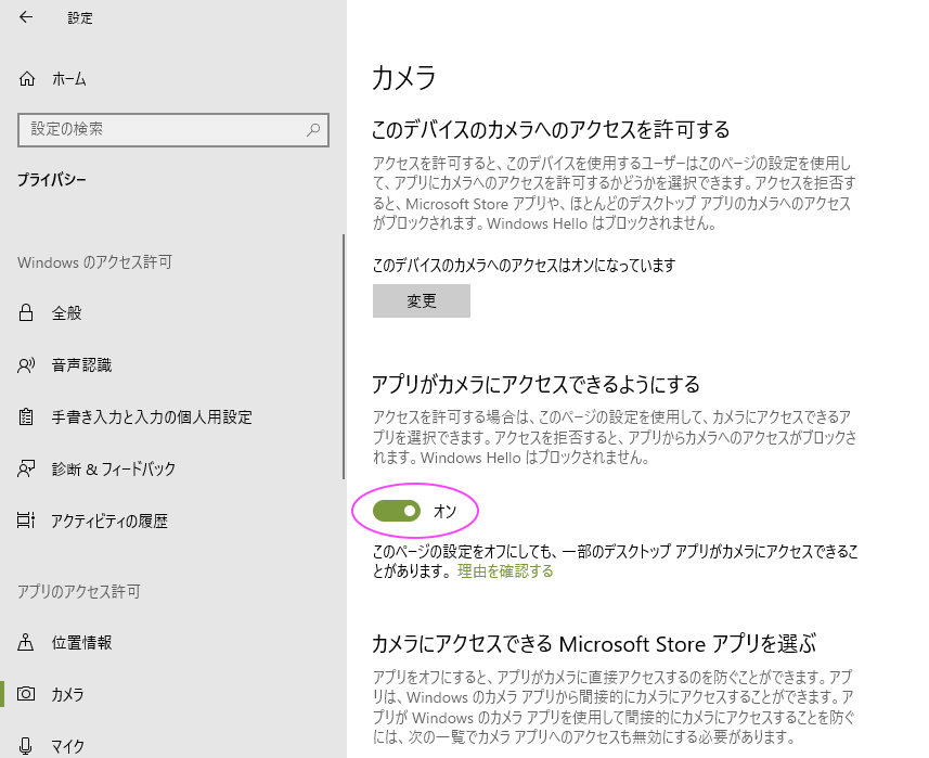 - Windows: 設定 > プライバシー > カメラ