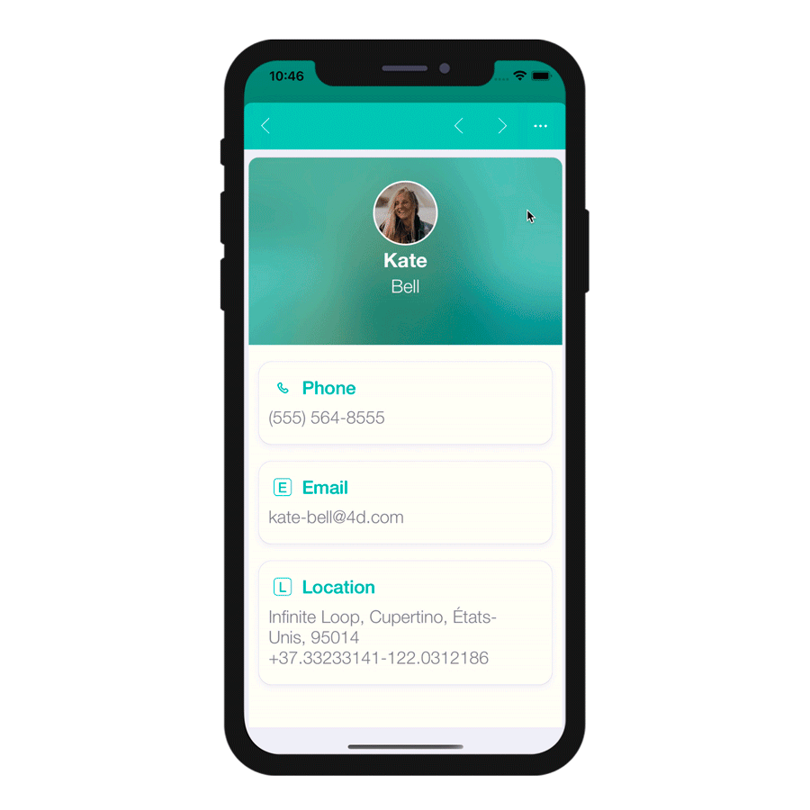 Uživateli bude stačit vybrat z nabídky akcí akci editContact, aby se v mobilní aplikaci zobrazil akční formulář. Odtud mu pak vstupní ovládací prvky akce poskytnou možnost vybrat telefonní číslo a e-mail z aplikace Apple Contact.