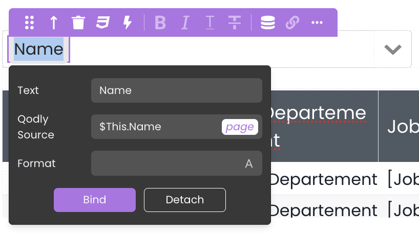 Pole „Qodly source“ umožňuje přiřadit výběr entit, který naplní datovou tabulku. Pole „Vybraný prvek“ načte vybranou entitu, která je ekvivalentní položce „Aktuální prvek“ ve výběrovém seznamu.