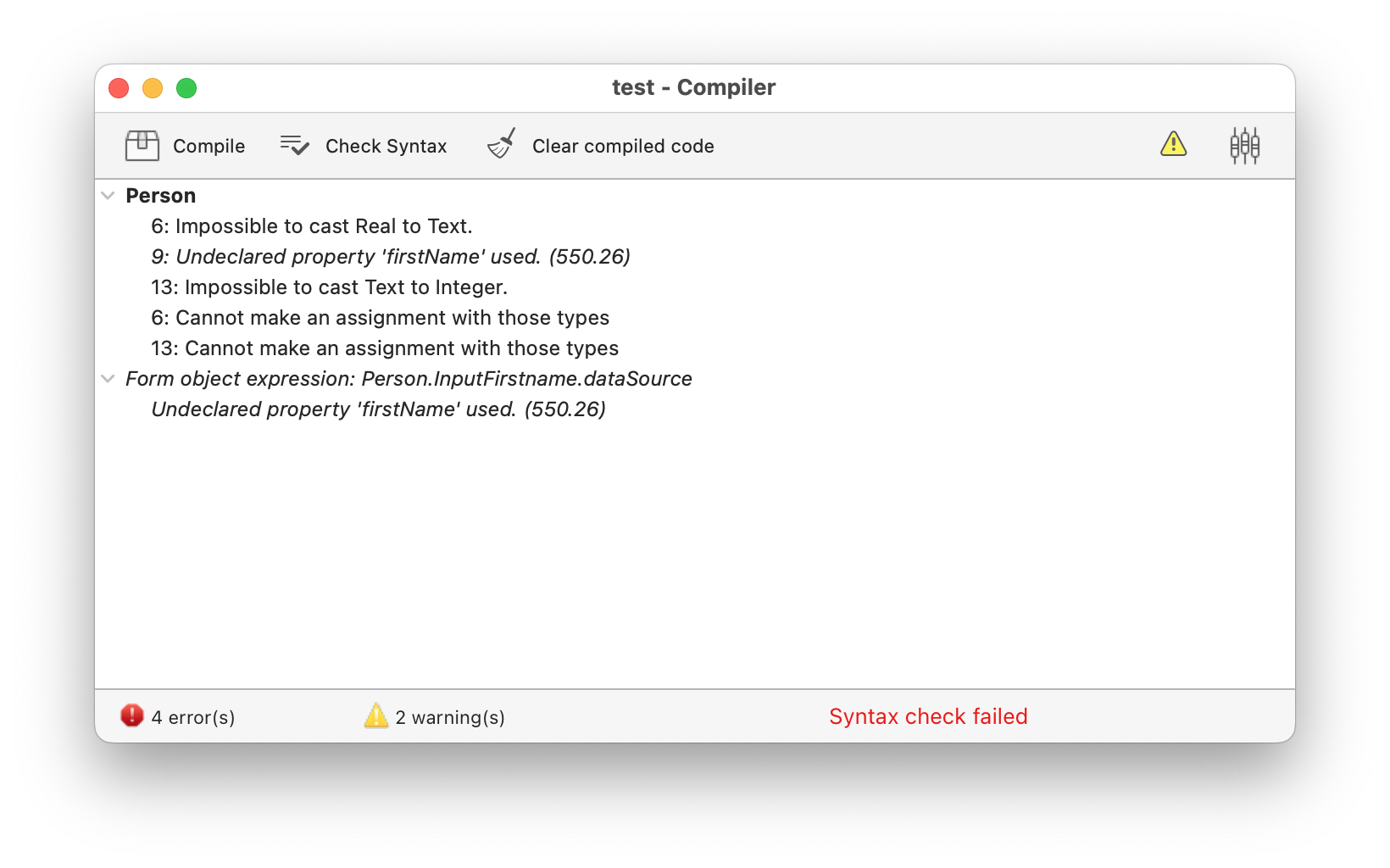 V případě neúspěšné kompilace se zobrazí příkaz Compile project příkaz vrátí objekt s varováními a chybami. Příkaz byl také rozšířen o možnost vracet varování nebo chyby zjištěné v objektových výrazech formuláře.