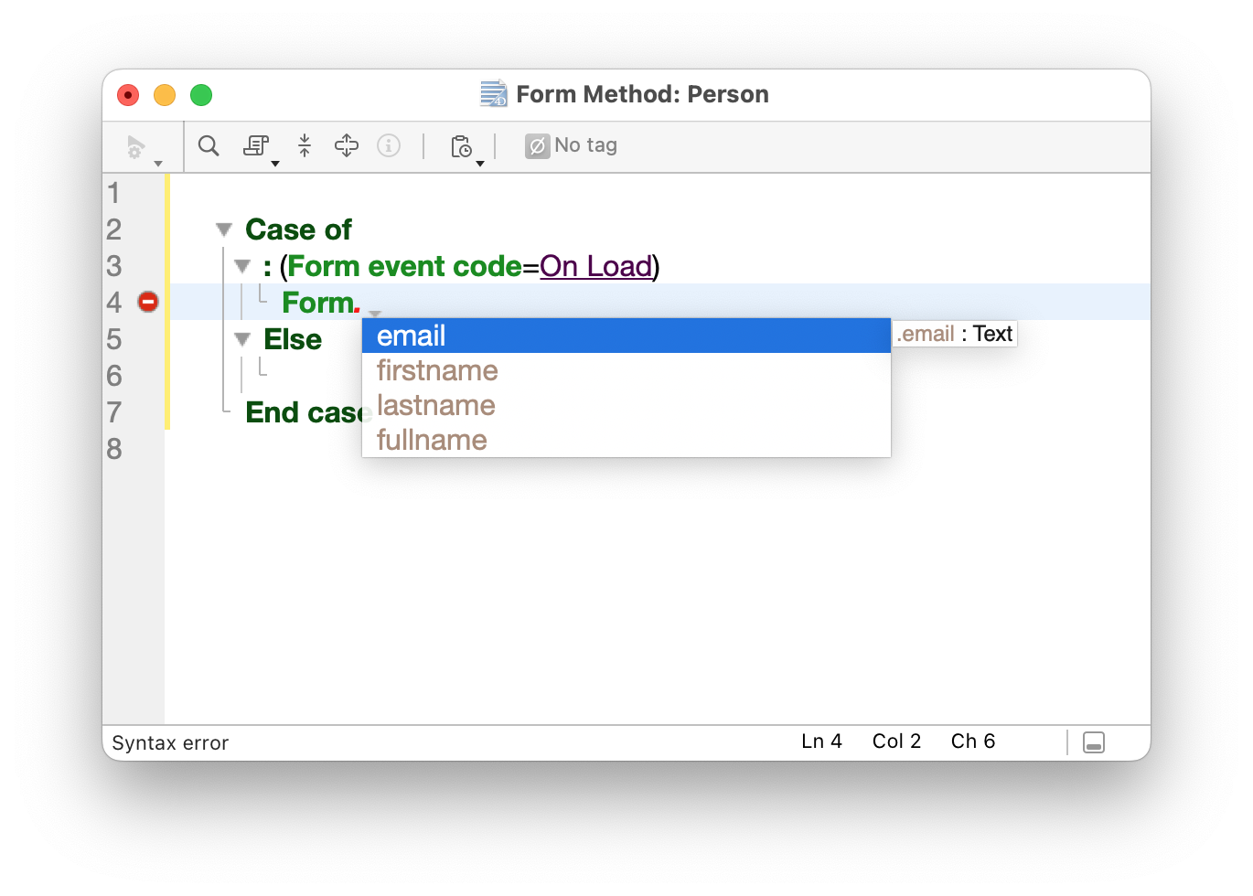 Funkce Form příkaz těží z funkce automatického dokončování v editoru kódu. Po zadání „Form.“ vám 4D nabídne všechny vlastnosti a funkce deklarované v přidružené třídě. Už žádné převracení dvou písmen v názvu vlastnosti nebo používání malého písmene místo velkého v názvu funkce.