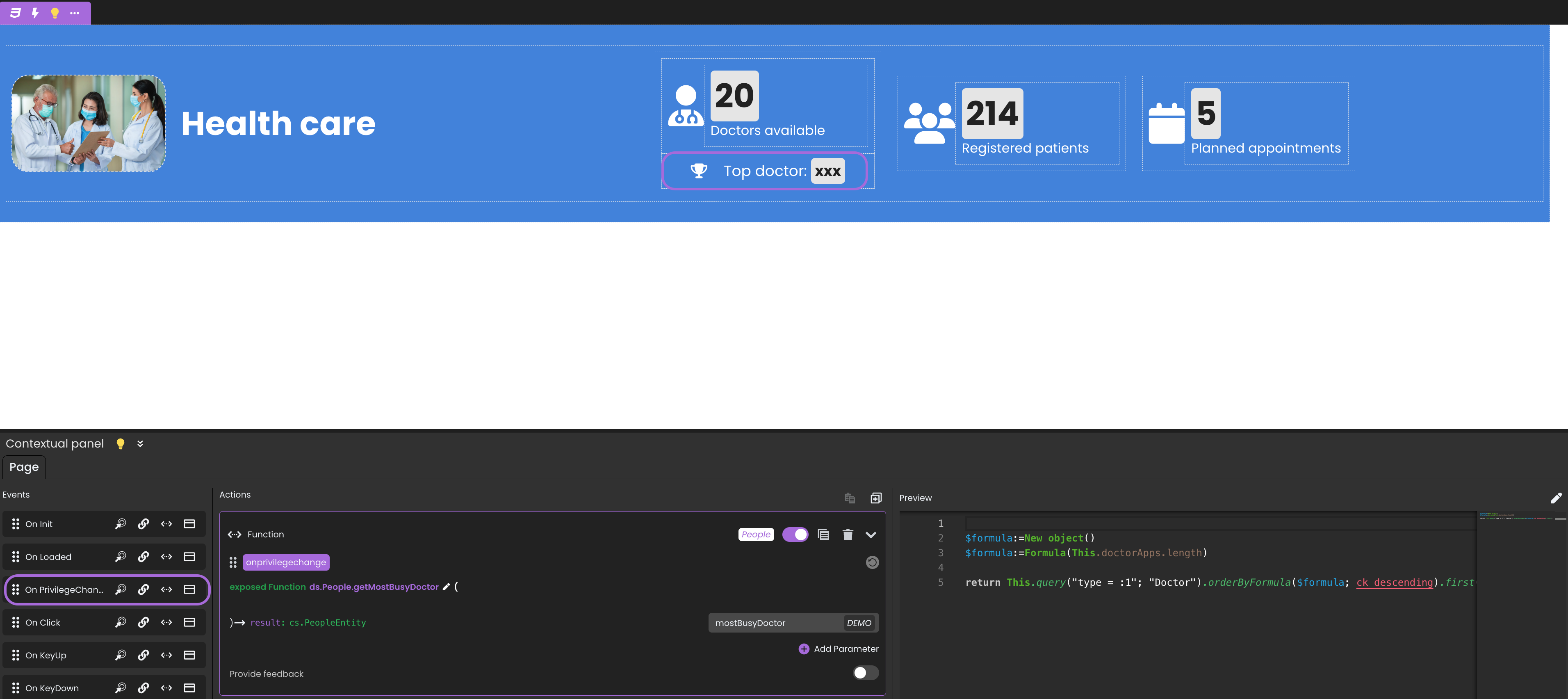 V příkladu níže má aplikace HealthCare hlavičku zobrazující statistiky (počet lékařů, počet pacientů, …). V tomto záhlaví se také zobrazuje nejlepší lékař (lékař, který má největší počet schůzek). Jedná se o sdílený zdroj Qodly(mostBusyDoctor) načtený při spuštění aplikace.