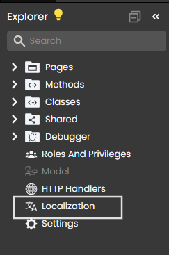 Im Explorer von Qodly Studio wurde ein neuer Abschnitt zur Lokalisierung hinzugefügt, um die Gebietsschemata Ihrer Anwendung zu verwalten.