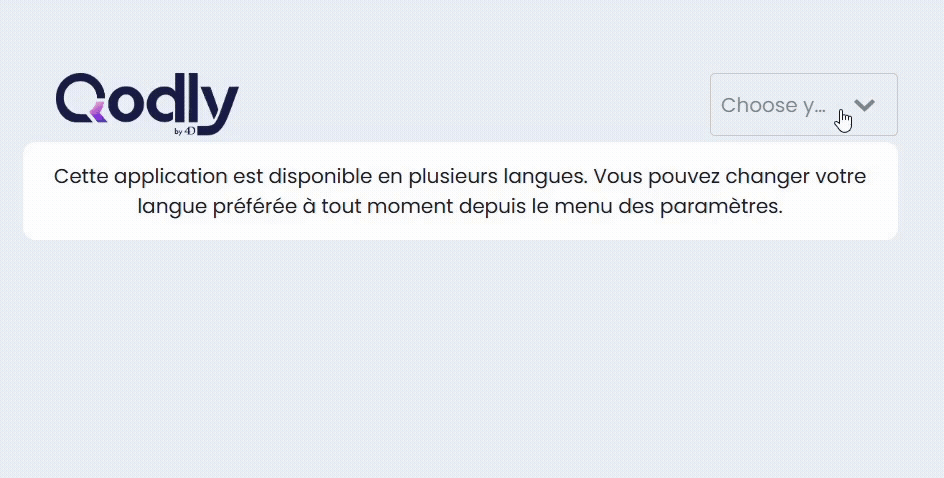 - Session-Stored Language: Wenn der Benutzer bereits eine Sprache ausgewählt hat, merkt sich Qodly diese. Die Auswahl wird in der Sitzung gespeichert und beim nächsten Öffnen der Anwendung automatisch angewendet.