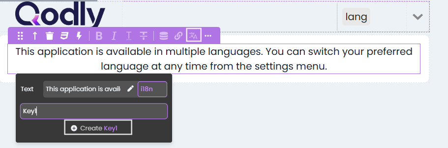 Wo immer„key1“ in der Anwendung verwendet wird, zeigt Qodly automatisch die korrekte Version an, basierend auf dem gewählten Gebietsschema. Das ist effizient, zuverlässig und ideal für die Skalierung Ihrer Anwendung über mehrere Sprachen hinweg.