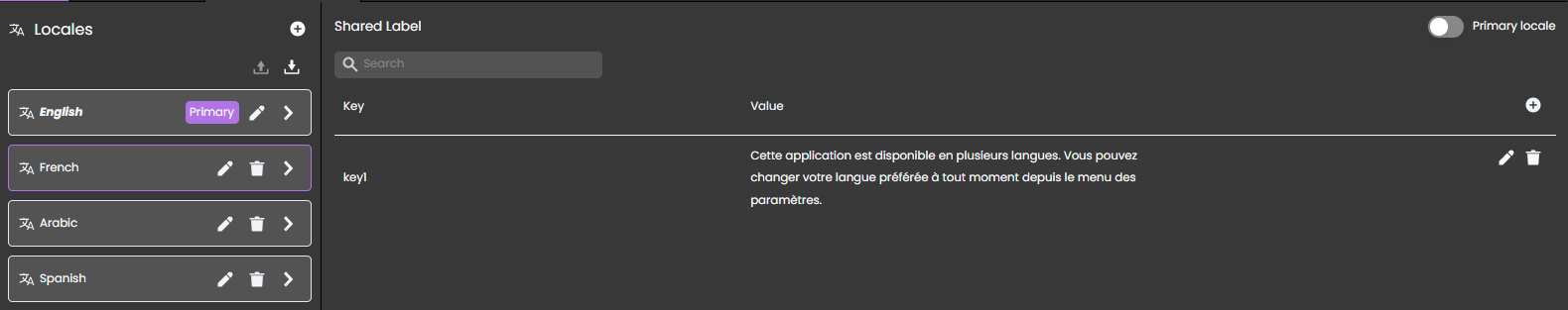 Alternativ können Sie Ihre Schlüssel auch über den Bereich Lokalisierung verwalten, in dem alle Schlüssel und ihre Übersetzungen zur einfachen Anzeige und Bearbeitung an einer Stelle angezeigt werden.