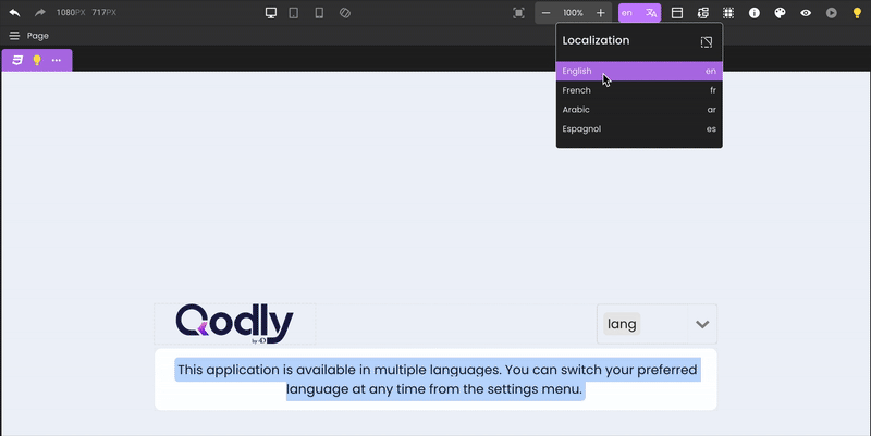 4D Qodly Pro bietet einen Sprachumschalter in der Kopfleiste. Damit können Sie Ihre Qodly-Seiten im Bearbeitungsmodus in der Vorschau anzeigen und direkt übersetzen.