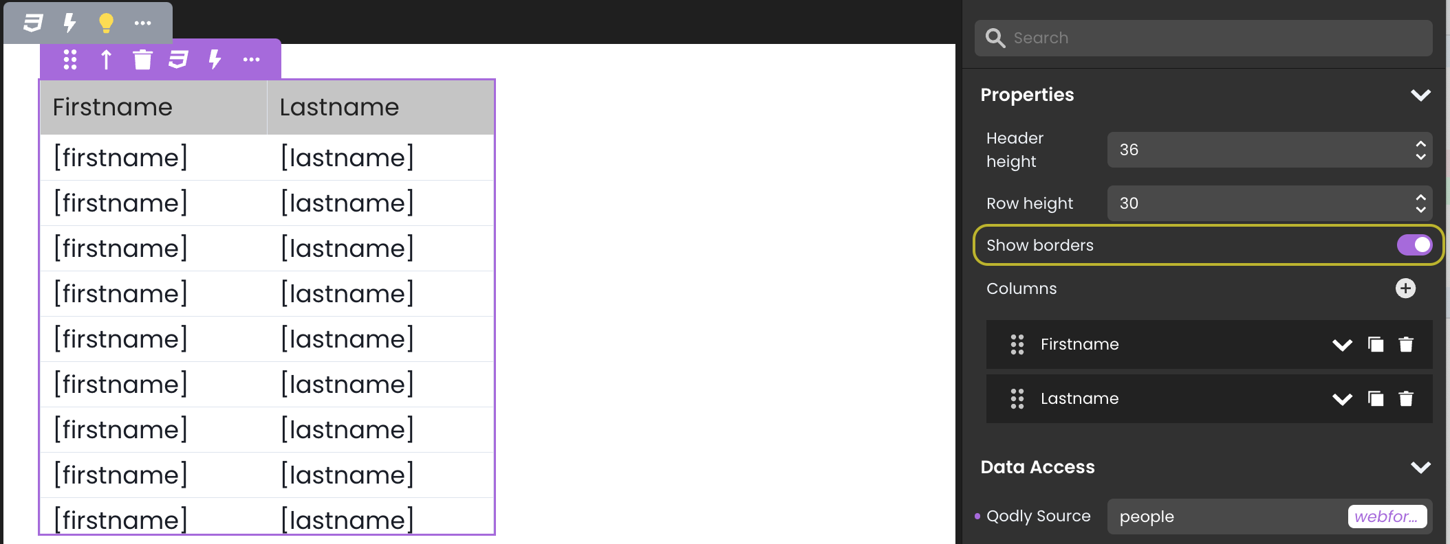 Für die Komponente Datentabelle ist eine neue Eigenschaft Rahmen anzeigen verfügbar, die eine genauere visuelle Unterscheidung ermöglicht.