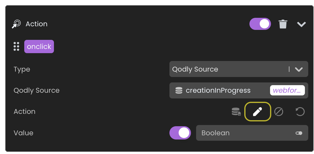 Wenn Sie z. B. auf das +-Symbol klicken, um eine Erstellung anzuzeigen, kann ein Boolescher Wert jetzt einfach verwaltet werden, um diese Aktion widerzuspiegeln.