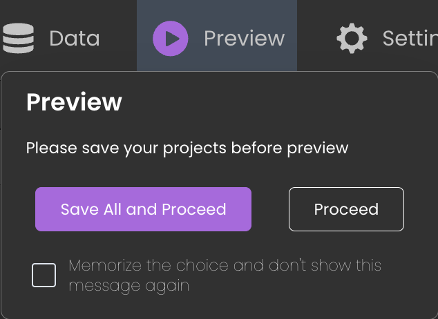 Vor der Vorschau der Anwendung wird eine Warnung angezeigt, wenn ungespeicherte Elemente vorhanden sind. Sie können wählen, ob Sie diese ignorieren oder alle Elemente speichern möchten.