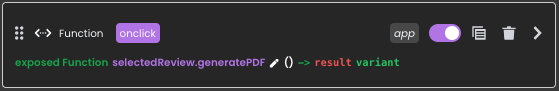 El documento final se genera directamente desde la interfaz web. Cuando un usuario hace clic en el botón dedicado, el evento «On Click» dispara la función «selectedReview.generatePDF()».