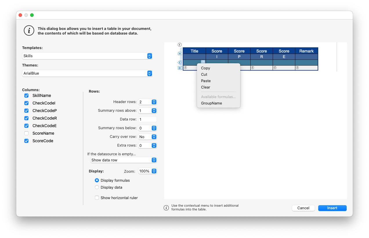 Un formulario de la aplicación Desktop permite crear estas plantillas de forma simplificada. Para añadir fórmulas fácilmente, una lista desplegable propone todas las fórmulas pertinentes para la plantilla.