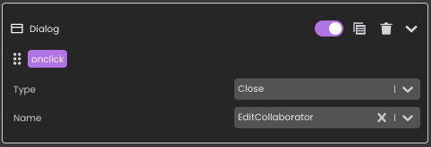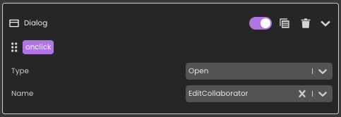 - Sur les boutons Edit et Create, ajoutez l’action Ouvrir la boîte de dialogue.