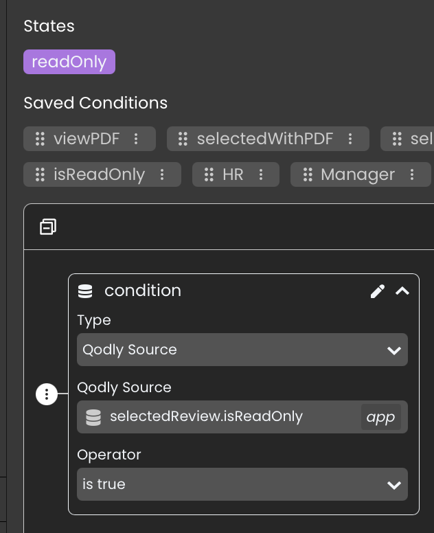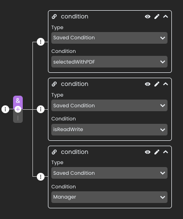 Par exemple, pour définir la visibilité de l’état « readWritePDFManager« , nous définissons les conditions suivantes : selectedWithPDF, isReadWrite et Manager.
