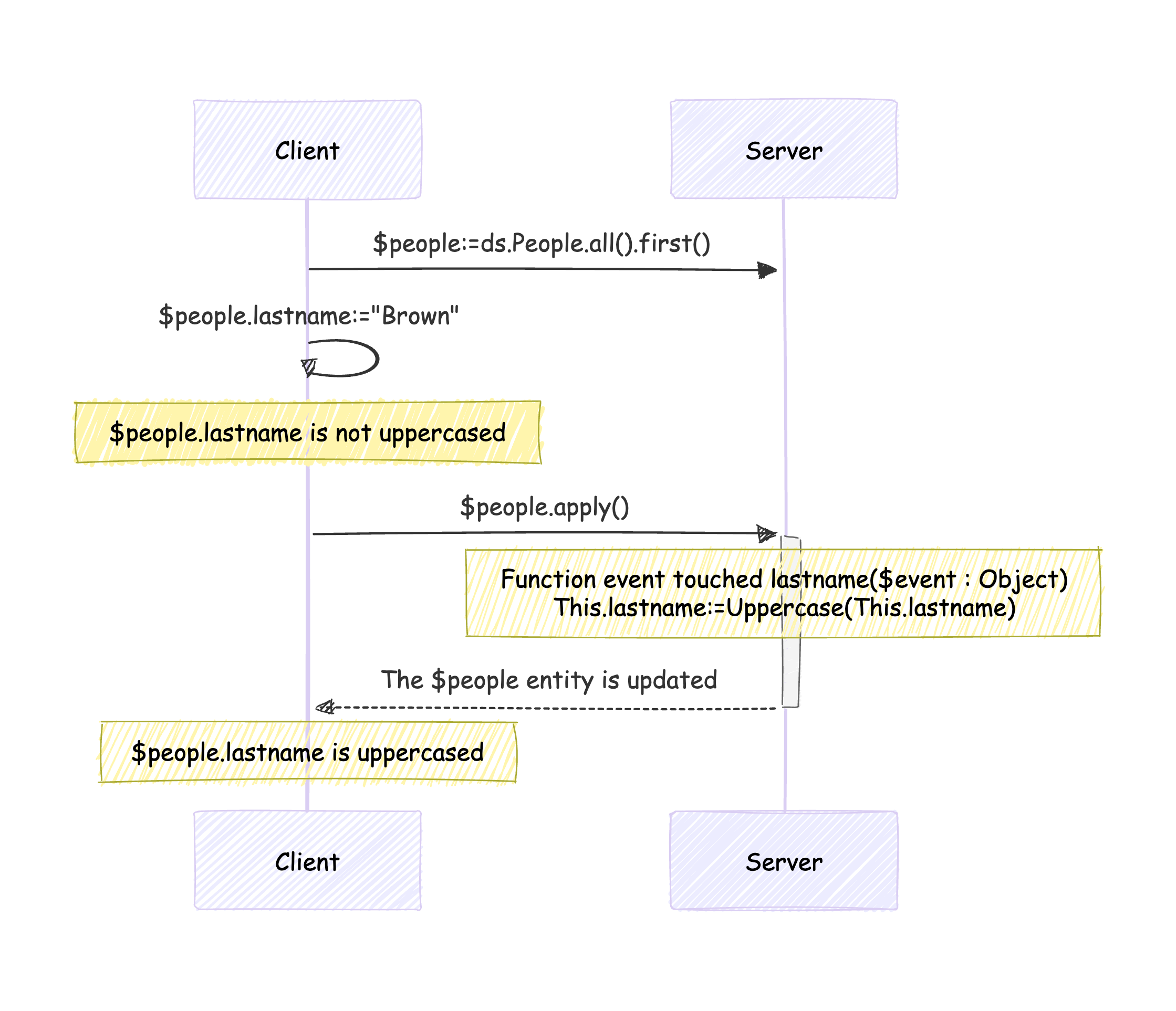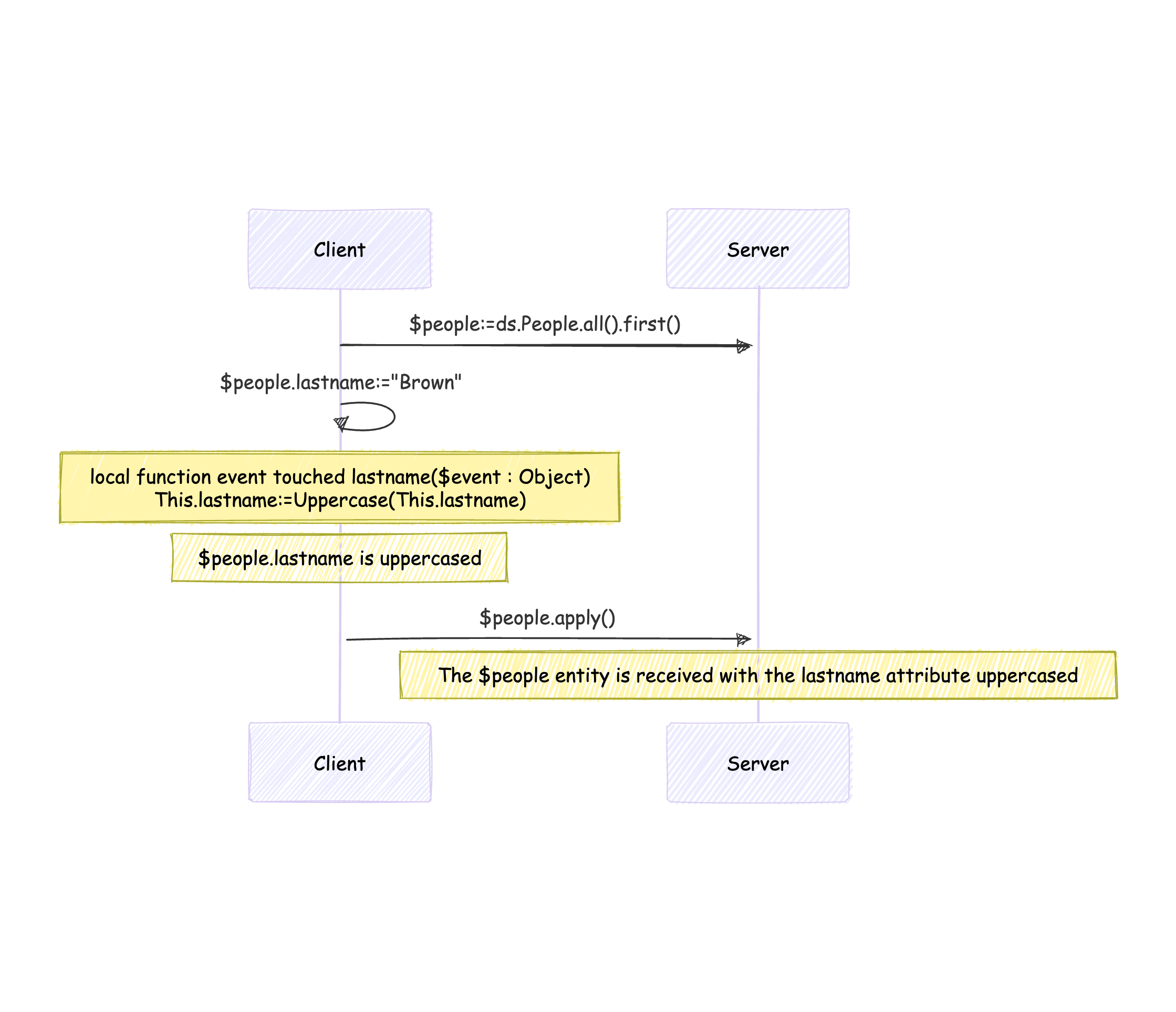 Dans cet exemple, la fonction apply() est une fonction fictive, destinée à rendre visibles sur le serveur les mises à jour effectuées sur l’entité sur le client.