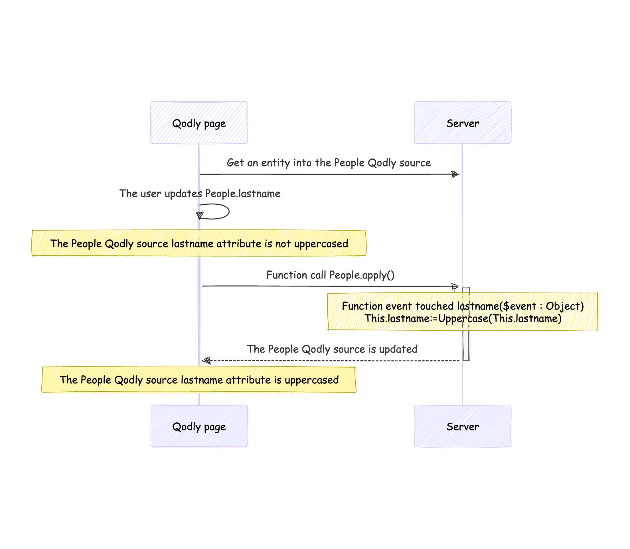 Ce cas est simple : puisque toutes les actions sur les entités sont effectuées via des requêtes REST au serveur, les événements constructor et l’événementtouched sont déclenchés sur le serveur dès que la requête est exécutée.