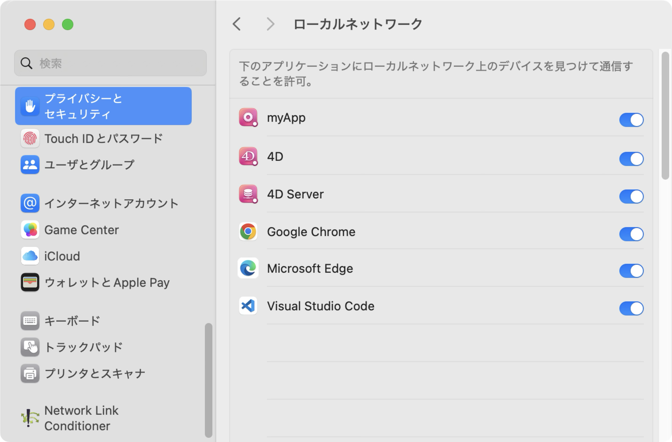 Sequoia バージョンでは、macOS はプライバシーとセキュリティの設定の一部を、アプリケーション名ではなくアプリケーションUUID に基づいて行うようになりました。そのため、複数のアプリケーションが同じ UUID を共有している場合、システム制御で問題が発生する可能性があります。このテクニカルノートで説明されているように、これは特にローカルネットワークアクセスに関連しています。関連する設定は、システム設定ダイアログの「プライバシーとセキュリティ」項目の「ローカルネットワーク」パネルにあります: