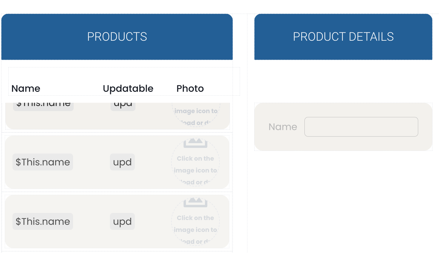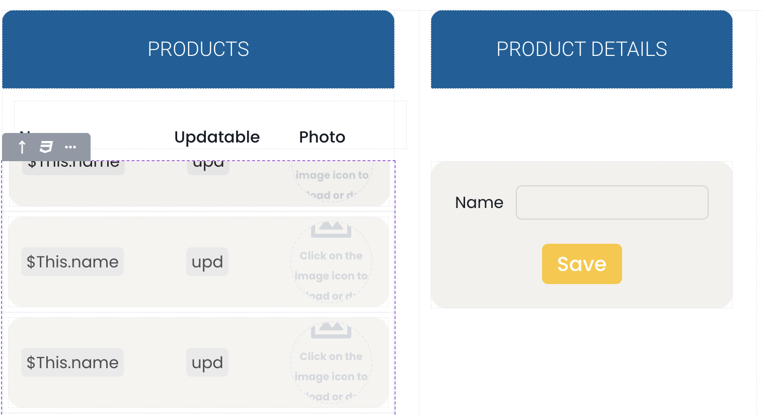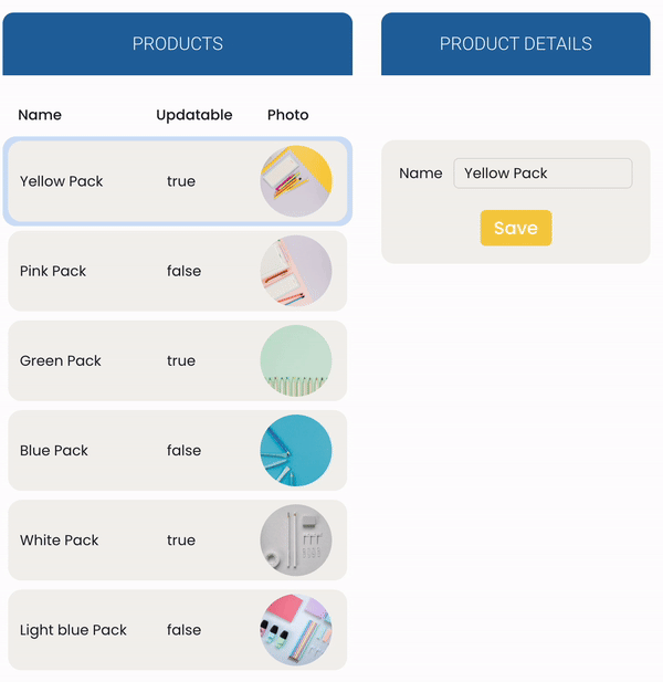 この例では、UIは商品のリストと、 最終的に選択された商品名を 更新する商品詳細セクションを表示しています。