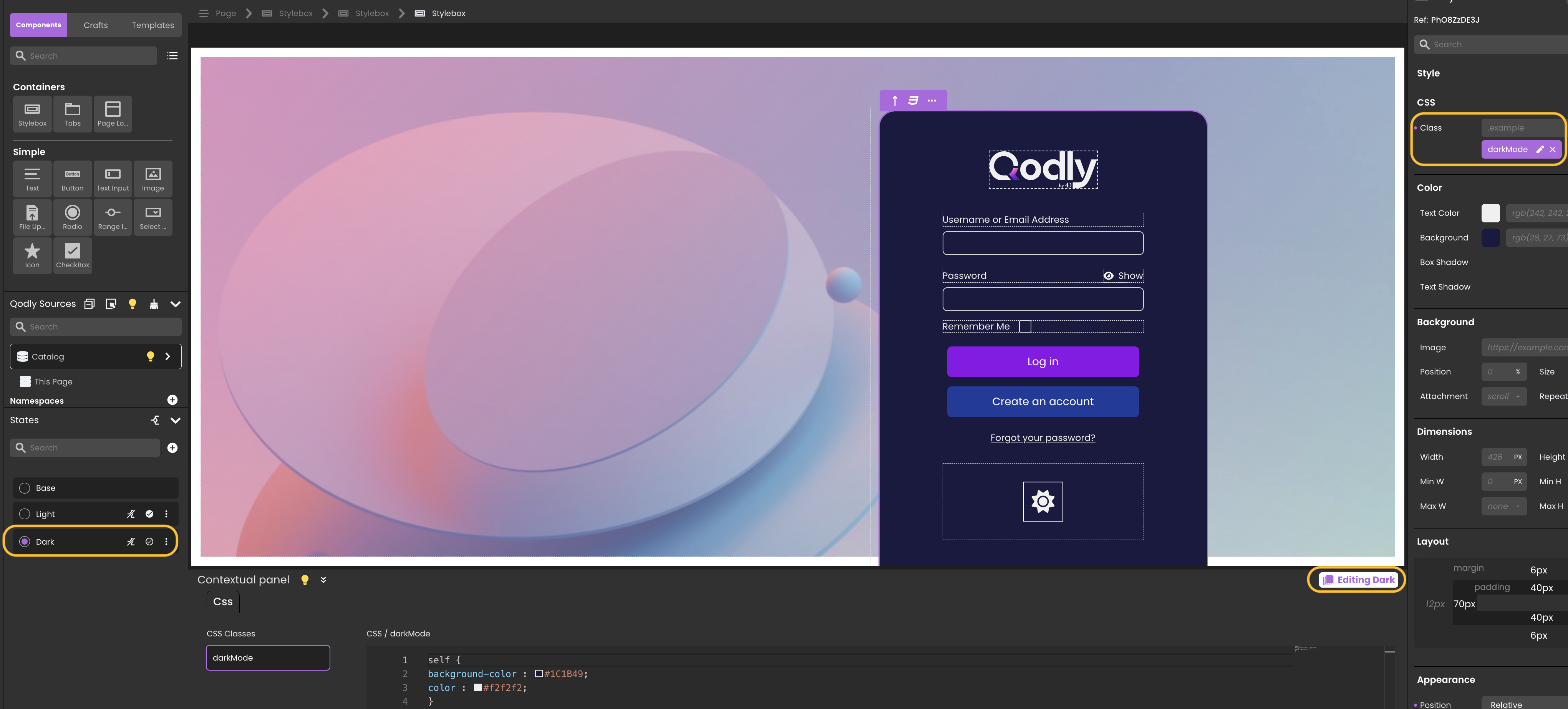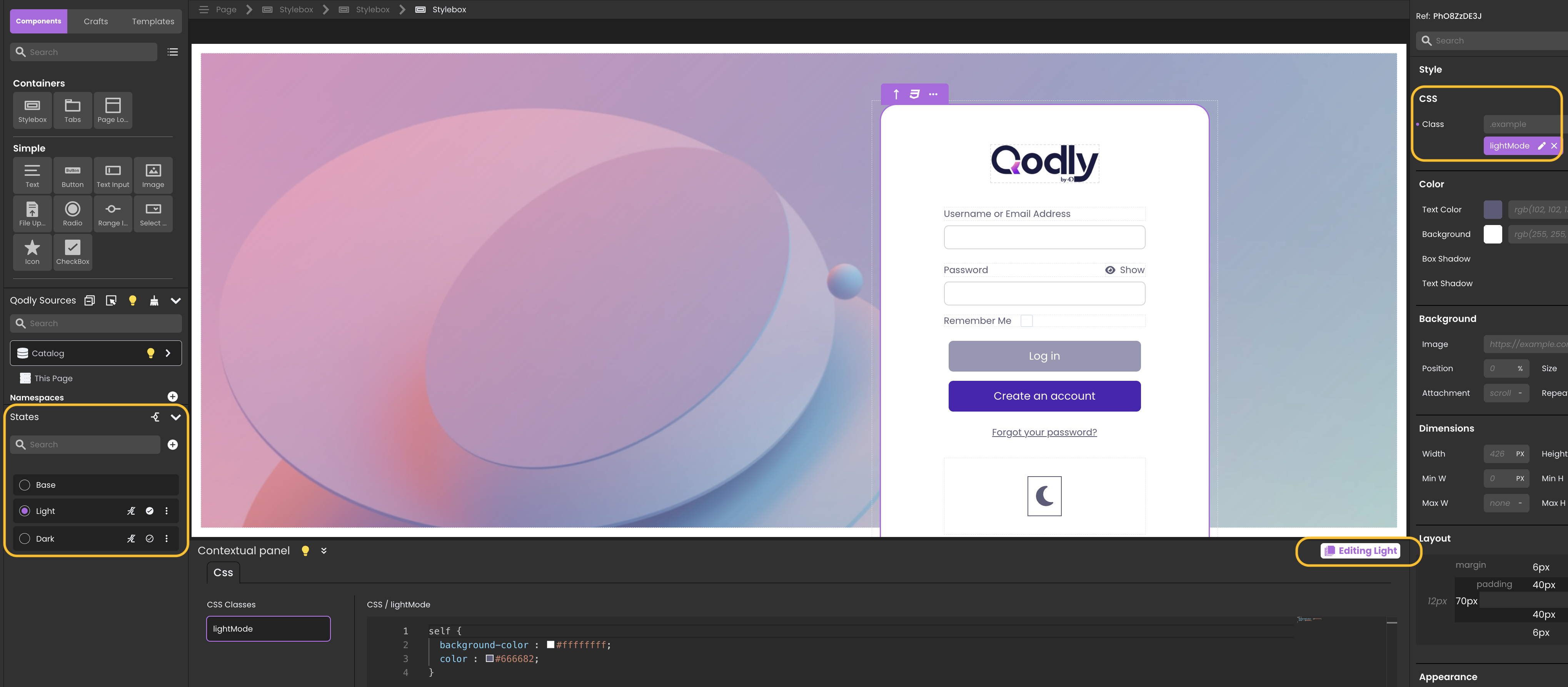下の例では、UIはライトモードとダークモードが用意されています。Light ステートはlightMode CSSを使用してライトモードを管理します。