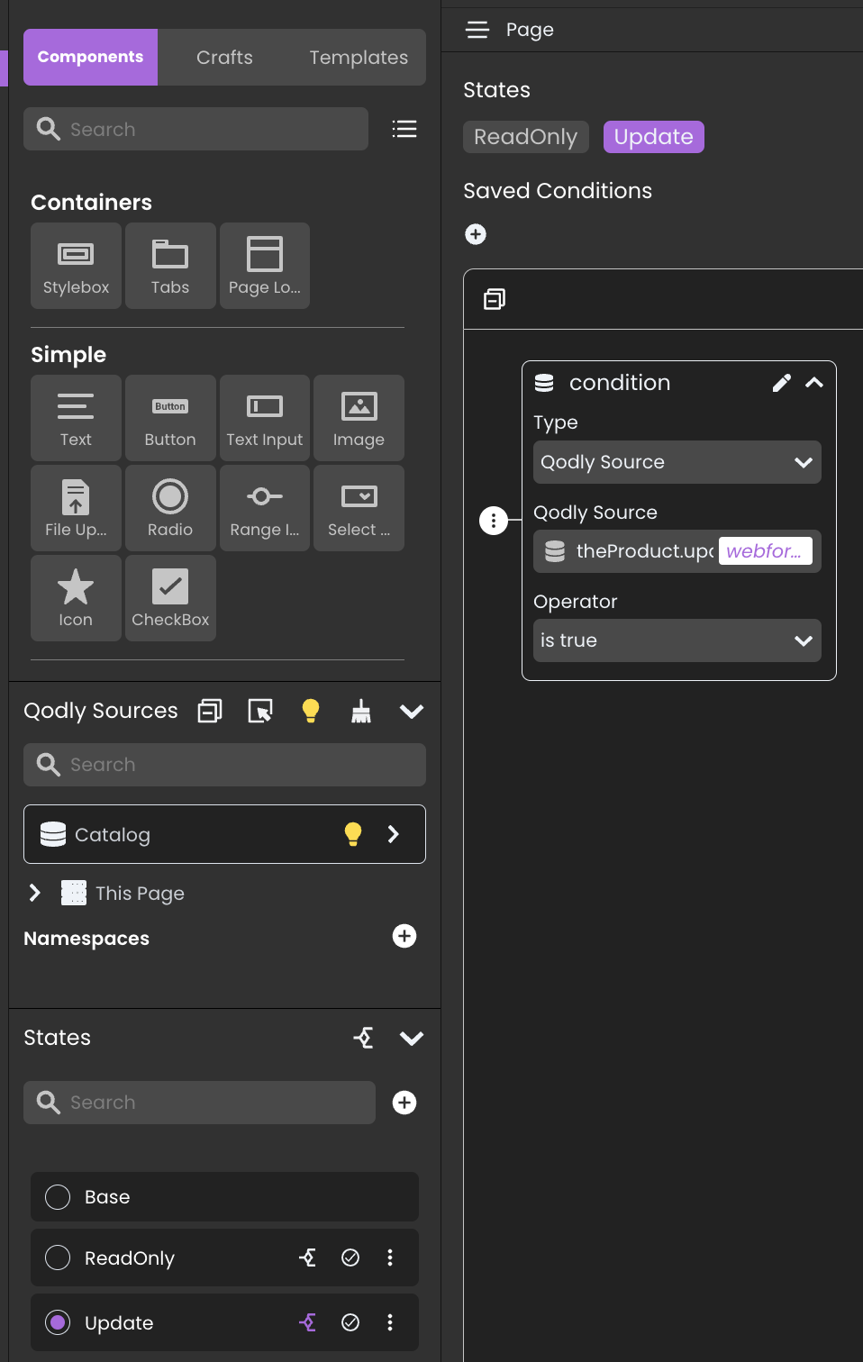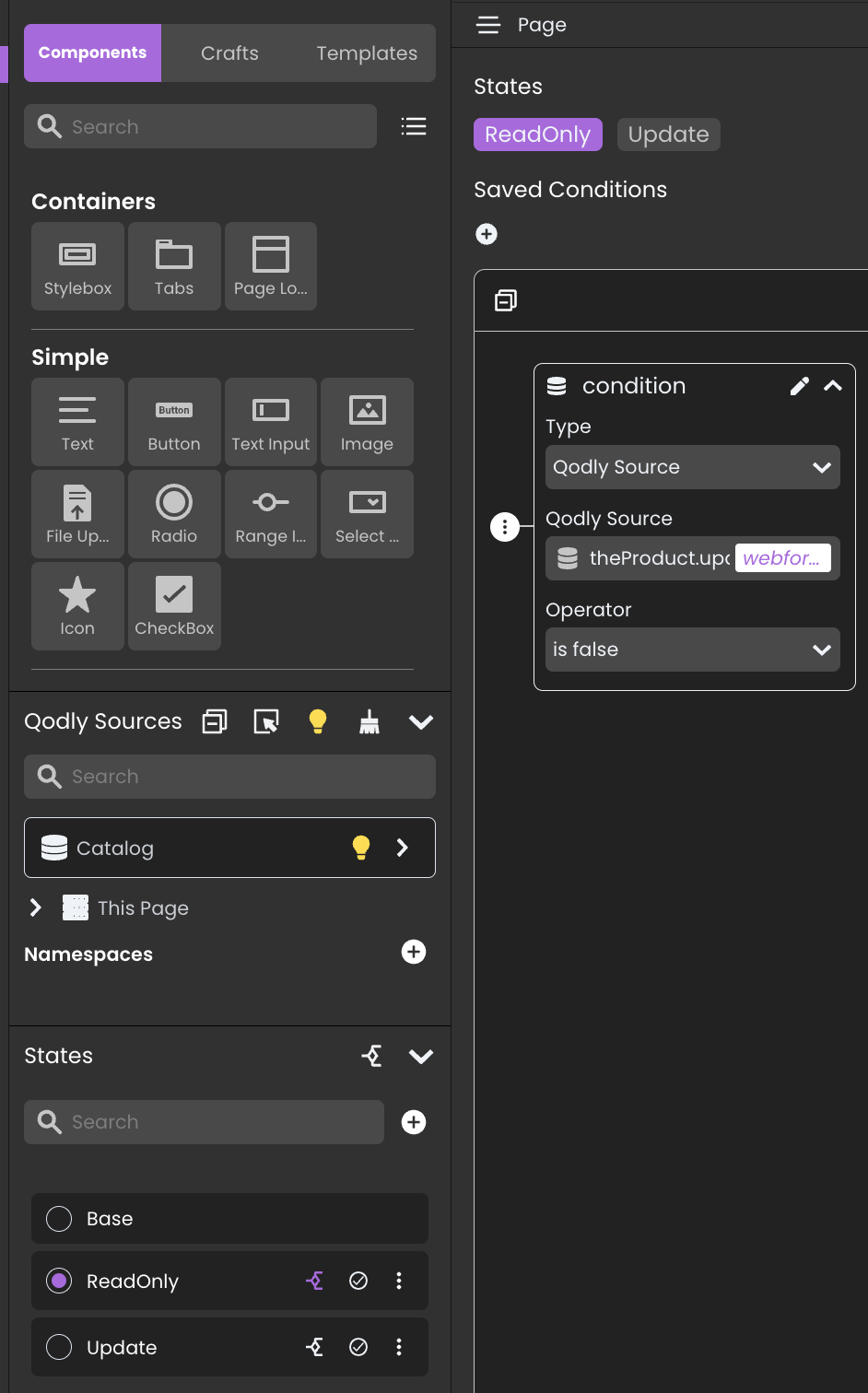ReadOnly ステートとUpdate ステートは、それぞれ条件に割り当てられています。商品を更新できるかどうかは、選択された商品のupdatable 属性に依存します。