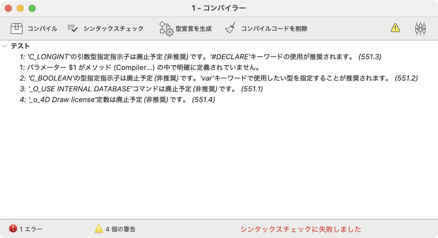 4D 20 R9 では、コマンド、定数、パラメーター、型指定子を含む非推奨のランゲージ要素に新しい警告が導入されました。以下のコードは、これらの警告のトリガーとなります:
