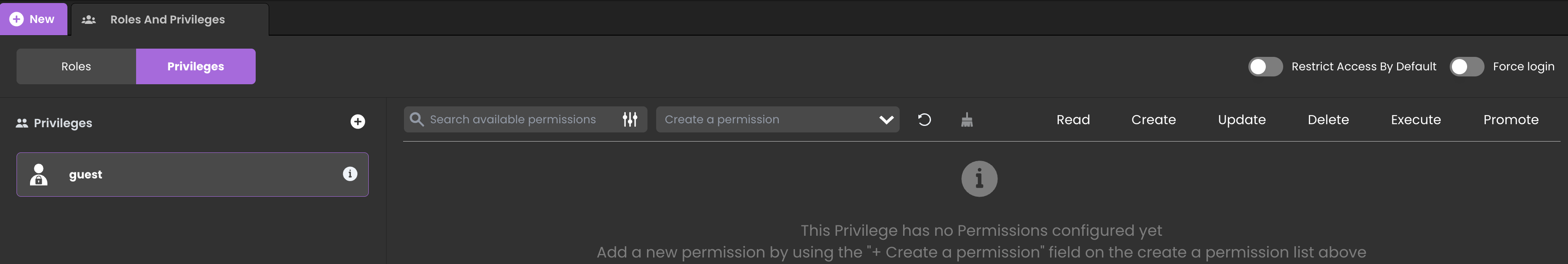 You may have already used the Qodly studio Roles and privileges interface. It offers a user friendly UI to set up the permissions for your app. This UI now offers to update the Restrict access by default property.
