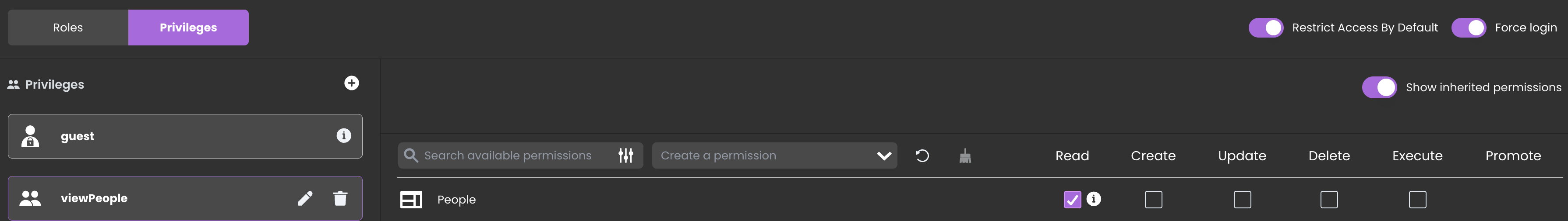 – the viewPeople privilege is required to read the People dataclass, other actions on the People dataclass are not granted